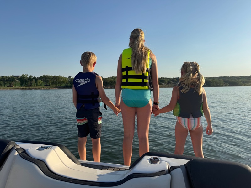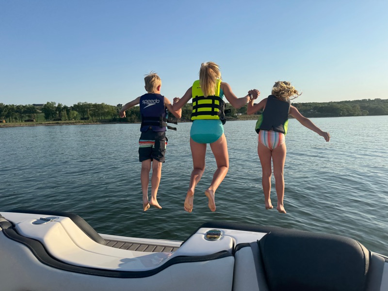 Late last year, we decided to sell the camper and rent when we want. It was hard to get away last year with ball and other commitments. For a consolation if you will, we decided to get a boat! We took it out for the first time in May. The kids decided it was a good idea to jump in- I wasn’t getting anywhere close to that water!